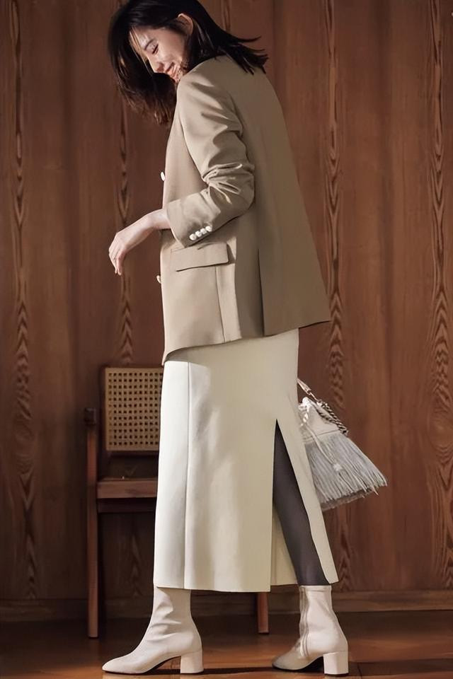 廓形西装+修身裙:宽松西装罩住上半身,搭配直筒裙或包臀裙,用“外松内紧”穿出慵懒的性感。注意裙长不超过脚踝,避免拖沓。